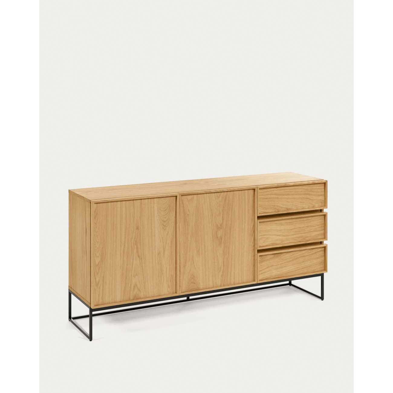 Buffet de la collection Taiana, en bois de chêne avec tiroirs et portes encadrés en bois massif de chêne. Sa structure en acier le rehausse et lui confère un look industriel. De plus, cela rend le nettoyage du sol plus facile.